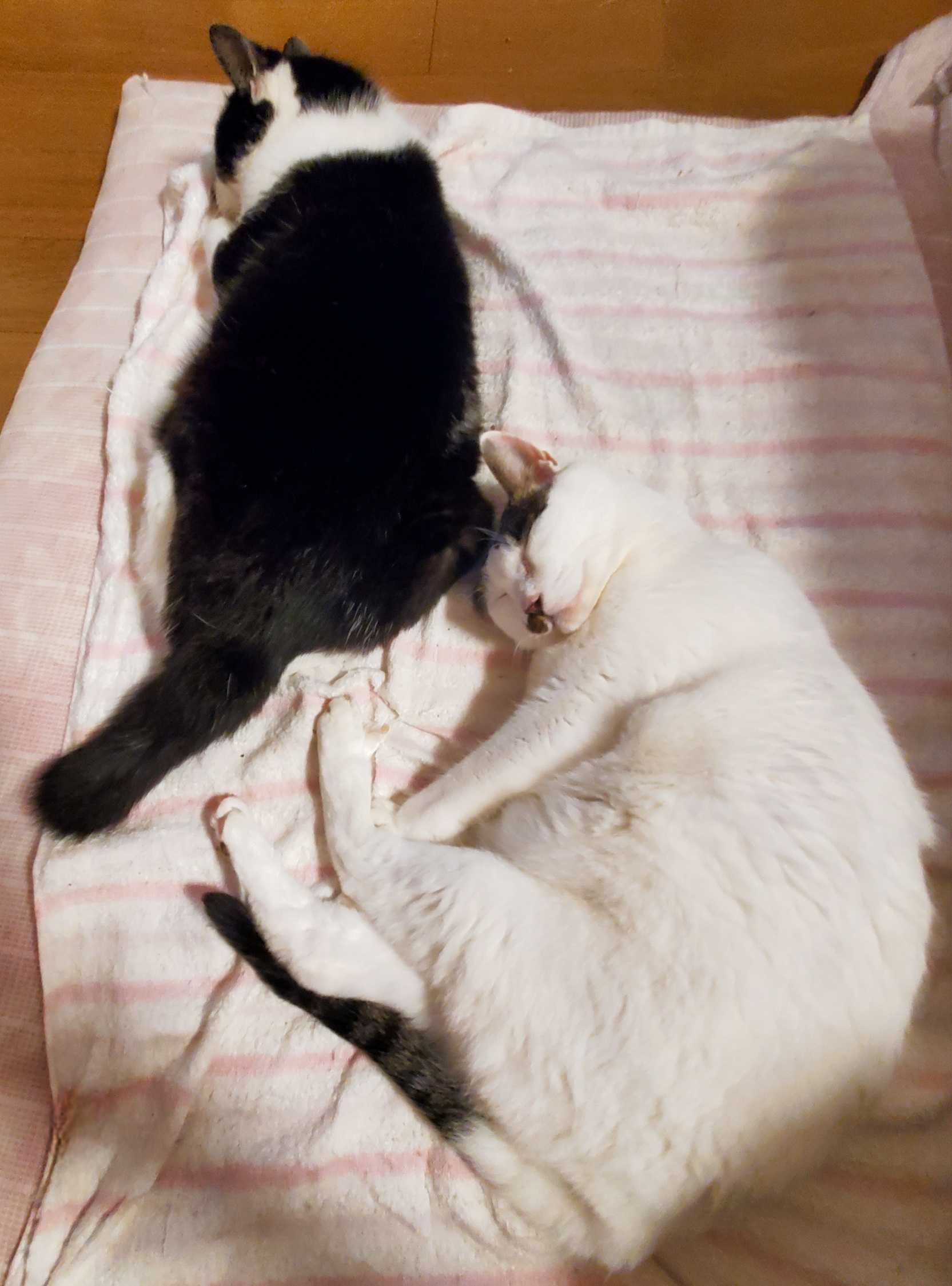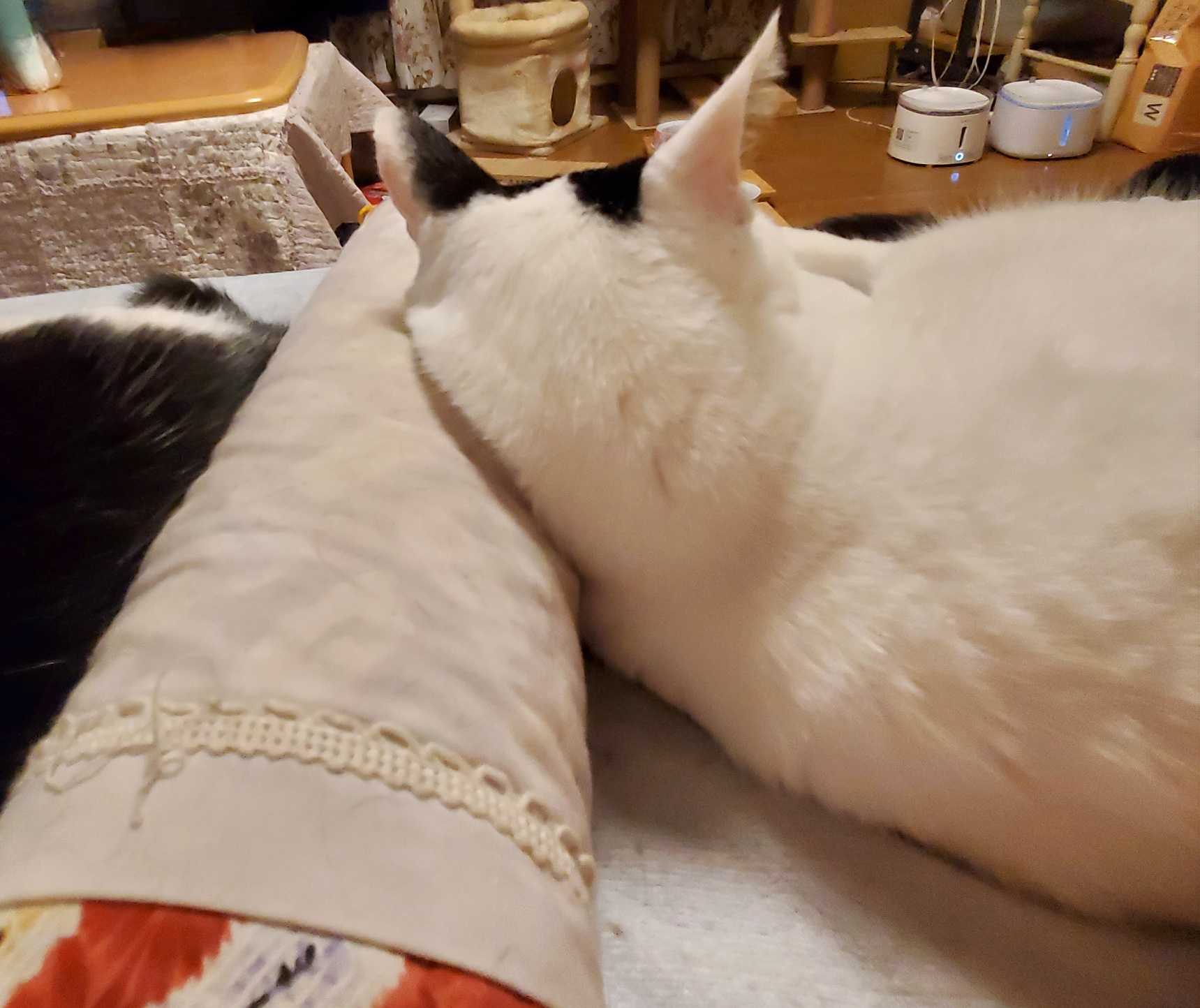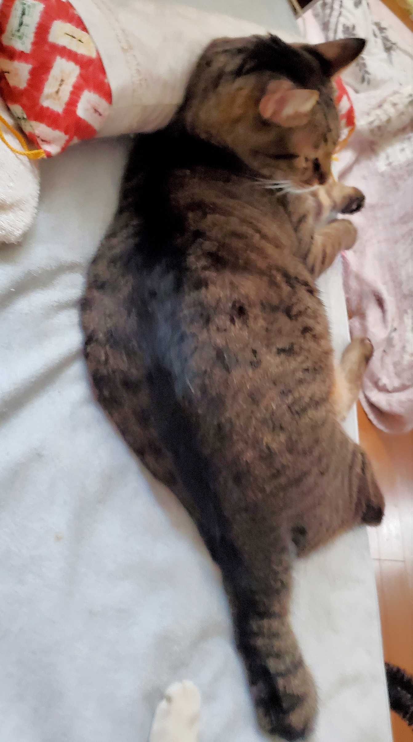 連日の猛暑で私は既にバテ気味です😅今日(21日)はお休みなので、ゆっくり出来ると良いのですが。午前中は昨日依頼された姉の髪の毛のカラーリングとカット💇♀️✂️(笑)そう言えば、コロナが流行ってから姉も私も美容院に行っていません😹↓たっくんも枕を使ってくれましたにゃ🐾下の白い手はチビ(笑)夜間、チロやシュガーちゃんが来ても良いように、夜の間だけ2つの猫ハウス以外に、玄関前にもカリカリを置いています。お互いにこの尋常ではない夏を頑張って乗り切ろうね。ただ、私の苦手な虫達が水を入れた鉢皿の周りに来るので…💧特にナメ◯ジは、嗅覚がとても敏感なのにビックリですにゃ🐱鉢皿の下に塩を付けておいたら気の毒かしら。さて昨日は、車で移動中(勿論、運転は私ではありませんよ)、やたらにアクビが出て頭がフラフラしていたので、職場に着いてから測ってみたら血圧の上が…64でした💦暫くして、少し元気が出てきたので再検したら、今度は下が104に💦全くどうなっているのかしら⁉️降圧剤の服薬調整に気を付けないと。