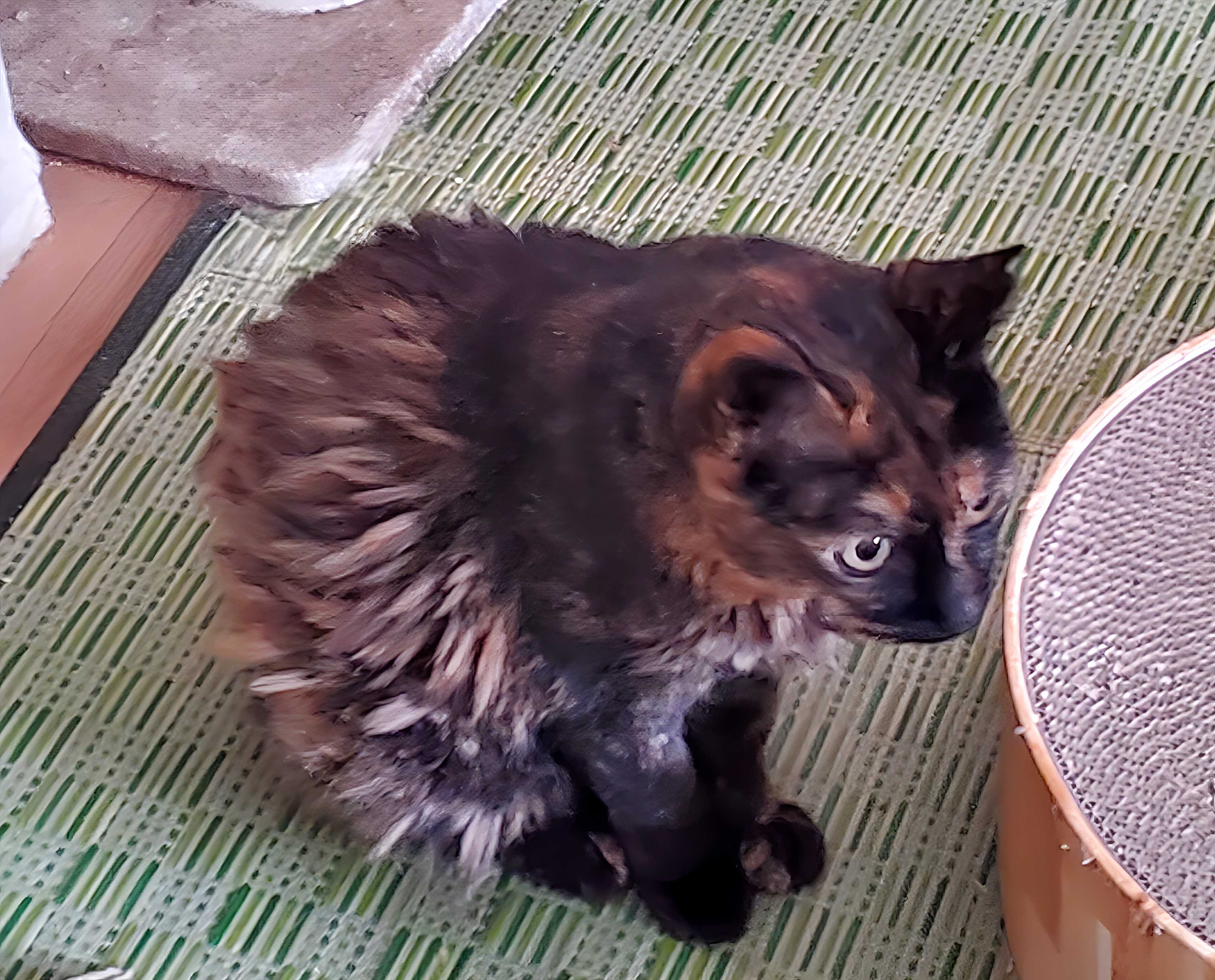 さて、先日購入済みのバリカン掃除機。ムーさんの毛玉❗気がついたら…既にフェルト状で、ビックリ👀‼️もう気になって気になって…💦体の左側は、2階の吹き抜けに居る時にチョコチョコ摘まんで死毛を取っていたので、毛玉はあまり出来ていません…が❗体の右側の状態(下の写真)を見ると、私はもう取りたくて取りたくてムズムズしています😹でも、普段のんびりしているムーさんなのに、逃げ足が素早くて…💧ムーさんは私が毛玉を気にしているのを熟知しているので、私の顔を見ると直ぐに逃げるのです(涙)最近は逃げられない吹き抜けの所よりも、階下の回転椅子の下に隠れている事が多いです😢こんな時、もう一人誰か居れば良いのですが、しょうがありません💦今度のお休みの日に…先ずは、ブラッシング等に馴れているチビと美優達でリハーサル(練習)してみようと思います。もし一人で上手く出来ない場合は、またワクチン接種時に病院にお願いし、以降は毛玉が出来る前に定期的にカラーを付け、ネットに入れてトリミングを自宅でやろうと思います。