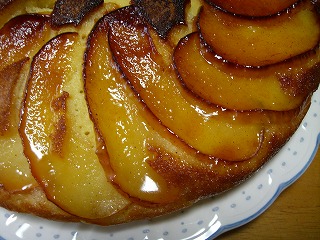 フライパンで1ホール りんごホットケーキ★ りんご好きの息子へのおやつ---22センチのフライパン--- 1 りんご1個は、5ミリ程度にスライスしておく。 2 ホットケーキを作る要領で、卵・牛乳・ミックス粉を混ぜ しっとり感を出すために油大2(うちではエコナ)を加えておく。 3 フライパンに砂糖30グラム、バター20グラム、シナモン少々を広げておいて スライスしたりんごを放射状に並べ、火にかける。 4 砂糖が溶けてカラメルができるが、それが焦げないうちに 種を流し込む。ふたをして、弱火で15分くらいかけるつもりでゆっくり焼く。 5 ひっくり返さずに焼き上げ、クシをさして何もついてこなければOK。 取り出すときは、お皿をフライパンにかぶせて、うまくひっくり返すのがミソ♪ 親子3人のおやつ時一枚ずつ焼いてると待ちきれない~ってことがあるけどこれだとお友達がきたときも揃って「いただきます」ができるよね。