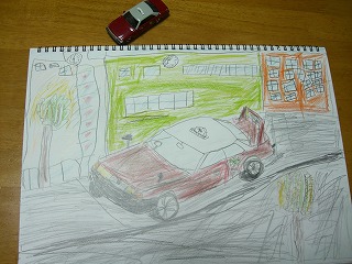 春休み初日は雨模様です工作好きのにゆは、今日も朝から、アクリル絵の具が欲しいとお買いものにいきました。先月から、ギコギコ・トントンと木やら、チョウバンやら、キャスターやらを使ってトミカくんたちが入れる開閉式の新幹線を作りかけては、中断していたにゆでした。ほっぺも、手も、絵の具の勲章が・・満足いくまで、塗り終えたあとは今「保証書」まで作っているようです。わらえる~ こちらは2日がかりで作った、ロータスヨーロッパらしいです。私が子供の頃、少年たちが読んでいた「サーキットの狼」のチラシをにゆは、どこかで見たようです。 そういえば、ロータスって最近見かけませんよね。車好きのにゆには、とても新鮮に見えたらしくて、はまっています。