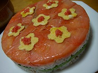 3月3日、年に一回だけ、ケーキ型で作る巨大「ますのすし」もどきスモークサーモンとアボカドで3色を表現。クックパッドの皆さんからヒントをもらって毎年、子供たちも、これを楽しみにしてくれるから作ってる定番。卵の花には、いつも「いくら」を乗せていたけど、去年から、にゆくんがいくら嫌いになってしまい、今年は紅生姜。安上がりで助かるけど、頑張った割には華やかさに欠けるなぁ。 ポップでかわいいアメリカ食器☆彡
