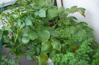 今日は、米袋のじゃがいもと、ペットボトルの人参の経過報告です。2月に植えつけたじゃがいもの葉に、今、おんぶバッタの赤ちゃんが大量発生しています。直接芋をかじるのでもないし、おおめに見てあげようと思いましたがつぼみも出てないうちに、ドンドン葉っぱが食べられていきます。一匹ずつ退治するにも、かわいそうな気がして。虫かごの目よりも小さいバッタたち。にゆとゆずが協力して、ミニトマトの空きパックに入れてくれました。でもまだまだ、追いつきません。葉っぱには、まだうじゃうじゃ住み着いてます。怖がりのゆずも、パックに入ったバッタを、観察して宿題の「あのねちょう」に書くようです。このままでも、ちゃんと収穫できるでしょうか?叩いて追い払うと、今度は、そばにある紫蘇の鉢植えに被害が出そうです。(去年は、やつらに紫蘇が食べられてしまいました)ペットボトルでの人参。心配なことに、土の中にコケが生えてきました。植木鉢のときは、心配なかったのに、透明容器なので、光合成して土の中のほうまで、コケが見えてます。ペットボトルで大根や人参を作ってらっしゃる方は、どんな工夫をされてるのでしょうか・・・ふたりのチャレンジ2年生のミニトマトに、やっと一つ、花が咲きました。植え替えたほうのが、ちょっと背が高くなってます。つぼみがいっぱい。黄色か赤か、二人とも楽しみにしています。