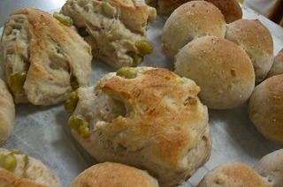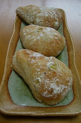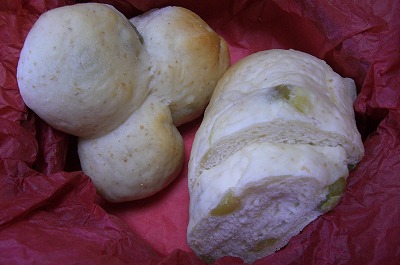 またまた、調子に乗ってますリュスティックリュスティックにモルトパウダーという材料が出てきます。1グラムとか・・・注文する予定がないのでいつも、モルトパウダーのいらないレシピでやってます。よく見れば、リュスティックというのはバターをつかわないんですね。同時に、豆なし生地も作りたい~と欲張りな私。 こっちの配合です。今回は、早めにクルミだけを入れて、こねを10分で止めてみました。(本来は、こねないものらしいので)で、パンケースから取り出し、羽を取って半分は、そのままケースに戻して発酵。あとの半分は、うぐいす豆を折り込んで同じパンケースの中、半分のスペースに戻して発酵。(一次発酵)そのあと、それぞれに成形してみました。10分のこねの方法。この噛みごたえ、私好みでした。こね・発酵が独立しているMKだからこそ、できるワザ?↑これまた、たいそうなこちらを使ってます