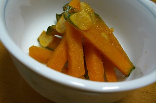 関東にお住まいの皆さん、台風の被害はなかったでしょうか。今は、あとかたずけに追われてらっゃるのかも知れませんね。遠い関西からお見舞い申し上げます。 仲良くしてもらってるmamaちゃんの日記からまねっこさせてもらいました。 かぼちゃとスライスアーモンドおいしゅうございました。ありがとう!私も味見していたら、半分まで減ってました~。今度から、多めに作ろう! こちらは、ひとむかし前に行った居酒屋さんのメニューをまねてつくる10年来、我が家の定番です。かぼちゃをマッシュして(水分は少ないほうが良)熱いうちにバターを加えあらかじめチリチリに炒めた、1センチ幅のべーコンも加えます。仕上げにシナモンを加えてまぜまぜします。バターとベーコンの塩分があるので、塩は最後に加減してね。この日は、刻んだクルミも入れました。