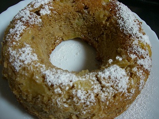 久しぶりのおやつです。りんごとパインとくるみのケーキ(17センチくらいのリング型デス)薄力粉 100gベーキングパウダー 小2塩 少々シナモン 小1無塩バター 80g(サラダ油に変更可)砂糖 100g卵 2個りんご 1個パイナップル 缶詰スライス2枚くるみ 40g 普段からお菓子を焼いてらっしゃるかたなら、細かいことは説明不要だと思いますので省略。。生地は、いたって普通のパウンドケーキの要領でよいと思いますが簡単で美味しいところはりんごを事前にソテーしないところ。生のりんごをいちょう切りにして、パイナップルとくるみと一緒に上の分量の粉類の半分をまぶしてから、生地にまぜちゃいます。自己流ではなくちゃんとしたレシピに則っておりますので、ご心配なく。