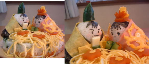 お雛様は土台が寿司飯でハムや卵、チーズ、海苔、キュウリ、二ンジンなどで飾り付けをしてみました。