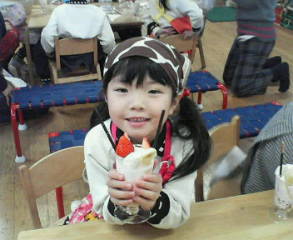 今日は、月ちゃんの保育参観日。とうとう・・・最後だなぁ・・こういう参観も。今日は、親子クッキングということでみんなでエプロンつけておやつ作り♪去年花ちゃんときはホットケーキ作りだったけど・・・今回はパフェ。みかん、パイナップル、バナナ、いちご、いろいろもりつけてヨーグルトやアイスクリームや生クリームでトッピング♪なかなか楽しかったです。かんせーい♪二人でらぶらぶで食べました♪