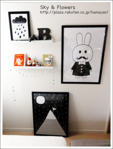 最近すごく気になっていた、miniwillaのポスター。子供部屋か寝室に飾りたいな〜と妄想してたんですが、楽天には取り扱いがないo(´^`)oすごく探しました。そしてようやく…届きました!撮影してる私の影が写ってる( ̄~ ̄;)なんか写真がぼけぼけで素敵さが伝わりにくいですが…このうさぎちゃんとお山のポスターです♪うさぎが「MR AGENT」で山が「BERG」です♪サイズはどちらも70×50cmで、でっかい!!でもでも可愛い♡♡可愛すぎる〜〜〜〜!!!!海外インテリア写真にいろんな物が映り込んでてお見苦しくスミマセン<(_ _)>とくにヒゲうさぎは子供達にウケがよかったです♪私は山の方も大好きですが…フレームはまたIKEAで買ってきました。会社帰りにダッシュで(笑)1000円しなかったです。ポスターを購入したのは↓こちらのお店です。http://monmarche2.cart.fc2.com/他にもminiwillaのポスターは色々あって、すごく悩んだんですが、「MR AGENT」と「BERG」の2枚を厳選しました!こちらのショップさん、他にも素敵なアイテムが沢山あってすっかりファンになってしまいました。オーナーの方がやってるブログも素敵です。 モノトーンのインテリアって、今までほとんど興味が無かったのですが、このポスターを買ってからモノトーンのものが気になって仕方がありません。でもでも、そんなにモノトーンのアイテムって持ってないので、コーディネートが難しいですね┗( ̄Д ̄;)┛部屋中白黒!って感じには私はやれないので、適度にモノトーンを取り入れた、可愛い部屋を模索中です…難しいけど…白黒ミックス 北欧-モダン-デザインちなみに「B」はハロウィンの時、こんなのを作ってたんですが、書体があまりに太すぎてイマイチだったので、失敗に終わったものを再利用しました(笑)スチレンボードをカッターで切って作ってます。ポスター、まだしっかり飾る場所を決めてなくてとりあえずで置いてるので、ちゃんと配置を決めなくちゃ!ちょっと部屋の雰囲気が変わって来たけど…楽しみです。ランキングに参加しています。↓ポチッと押して頂けると更新の励みになりますにほんブログ村