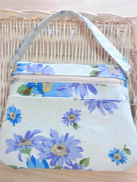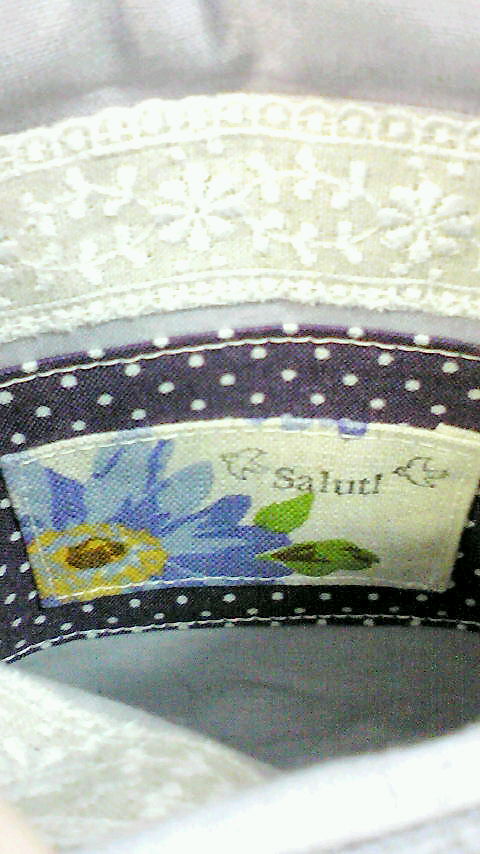 (^^;)レーシー‥、という割にはレースがないですね、存在感たっぷりの柄なので、レースはつけず、中のポケットにリネンのレースを付けてみました***マーガレットの布でタグを作って***♪