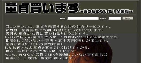 最近こんなトラックバックが来てませんか?ドウテイ好きの女性が急増している為、緊急募集させて頂きます。今回は緊急募集とゆう事もありまして、登録された方先着100名様に無料ポイント 10万円の当たる抽選権利を差し上げています。先着100名様のみとなっておりますので、ご登録希望の方はお急ぎください。マジ?童貞を買う人が急増してるの?知らなかった.....けれど、緊急募集?もう、見に行くしかないねクリックだけだし見るだけだし見てきましたで、ココ注目ですよいけませんねぇ非常に良くない売春防止法第3条(売春の禁止) 何人も、売春をし、又はその相手方となつてはならない。何人もです。童貞だろうが無かろうが、売っちゃいけないんですお上の言う事にゃ~逆らっちゃいーけないんだ何て、真面目ぶってますが本当に注目しちゃったのはコッチあぁ、童貞ってば奪われるものになってたんですね僕がまだ若かりし頃は(まだ若いですが)あ、ガキの頃と言い換えた方がいいですねみんな童貞は捨てるものだと信じてましたこぞって捨ててましたそれが今は、売り物に...あぁ、取っておけばよかったの?世の中も変わりましたねうーん、しかしどうやって、童貞だって証明するんですかね自己申告?なら、売っちゃう?法律?何ですか?それ?最後に上記のサイトの管理人さん勝手に無断で画像使いました以上です。だって、貴方、法律破ってるし、著作権どうのこうのとか言わないよね?ね?