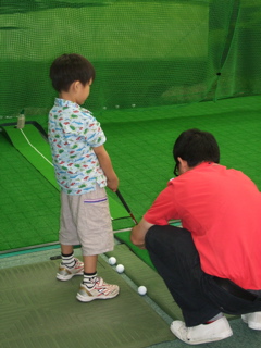 昨日、若の初めてのゴルフレッスンへ行って参りました~そもそも、何故ゴルフ?かと申しますと・・・・。おまつの夫は、大のゴルフ好きそんな夫の夢は、息子とラウンドをすることなのですが、小学校になってからかな?なんて、思っていたのですが。。。。この夏休み、若を、夏期スイミングスクールへでも入れようか、と思っていたおまつでしたが・・・・。本人に、拒否されてしまいまして・・・・・。それもかなり激しく・・・・。昨年は、夏期スイミングに行きましたので、今年も!と、思っていたのですが・・・・。で、テニスはどう?と、勧めてみましたら・・・・これも、拒否されてしまいましたの・・・・。(テニスは今年の春休みに見学済みでございますので、本人、何か気が進まない理由があるのでしょうね~・・・・。)なんだか、夏休み、ぼーーーーっと過ごすのも勿体ないわね~。と、おまつは思っていたので、何かさせたかったのですが、スイミングも、テニスも嫌ときちゃーどーすんのよ!サッカーは小学生以上って書いてあるしさー・・・。と、思っていたら、主人の通っているゴルフアカデミーで、小学生以上のクラスに入れてくれると言うじゃありませんか石川りょう君にちょっと憧れを抱いている若これは、いけるかも?と、ゴルフはどう? 聞いてみましたら、「おー、行ってみるぞ!」と、かなり乗り気じゃありませんか~と、言う訳で、昨日は若の初ゴルフレッスンと相成りましたのでございます。楽しみにしていただけあり、目を輝かせて、ゴルフレッスン場へ入っていた若・・・。あんなに目を輝かせている若を見たのは初めてでございました。昨日は、他のお子様のご予約が無く、マンツーマンのプライベートレッスンとなりました。60分のプライベートレッスンを5歳の若がやってのけたのでございます。母もビックリでございます。この年齢の子供は30分集中することが限界かと思っていたのですが・・・・。しかも、昨日は幼稚園での体操教室もあり、運動系のお稽古が重なっておりましたのに・・・。先生も教えるのがお上手で、若には良かったみたいです 好きこそ物の上手なれ・・・・。以外と、ボールに当たる若!こんな風に思う私は完全に親バカです!でも、親ばかになれると言うことは幸せなことなのです