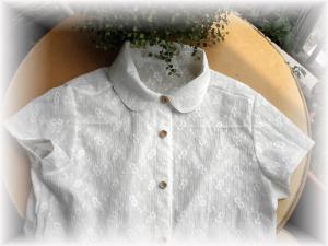 白ってやっぱり可愛いです。刺繍のお花もすごい可愛いし。。。こんな生地のブラウスはどうかな?と丸襟のブラウスにしてみました。ウッドボタンでナチュラル感が増した感じがします。一点ものです♪よかったら こちら からご覧くださいませ♪
