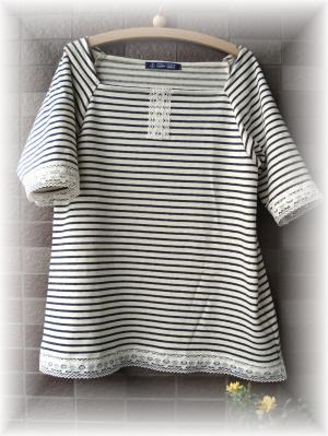 リックラックさんのボーダーニットでスクエアネックのカットソーを作りました。レースを袖口と裾にあしらい、胸元にも・・・一点ものです♪