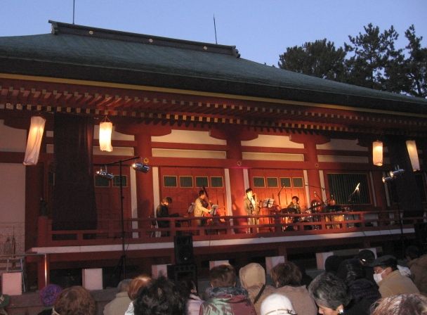 ♪ 花冷えのさくら篝火ジャズナイト火の粉は飛びて人はふるえて 「寺でジャズ」弘法寺の試みは、好きを刺激のイベントぞ。結婚記念の日とあれば、これ幸いとチケットの、予約を庫裡に申し出む。 晴れて迎えし篝火の火の粉舞い散る遍照院。妻をいざない訪れむ。本堂の外側で、未だ明るい6時頃にスタート 開花の声のちらほらと花の咲く木あればこそ、人のあふれた境内の賑々しくもなればなり。軽トラバザーのピザを買い、二人で喰いてカップ酒を飲んで待ちたるプロローグ。 折から吹ける北風のいよよ強まりよこなぐり。そ中でジャズの始まれば音色寒々風のうち、押して押されて流れゆく。 あまりの寒さ冷たさにステージ衣装打ち捨てて、防寒私服の無礼講。スキーの服に身を包み完全防備の吾なれど、妻の足先冷え冷えと限界超えのいよよなり。奥に使われなかった衣装が見える 女性ボーカル出でまして拙きまでの日本語と、津軽三味線じょんからで弦を切りたる余興あり。 250の定員を大きく超えし反響も、あまりの寒さ耐えきれず途中で抜ける人ありぬ。さもあらばキャパは百へと下るとも本堂内へ打ち入れば至福の時と人のいう。さもさてもなり住職のそれを許さず叶わざり、先の課題となりにけり。 一部と二部の間に行われた津軽三味線 見る方もやる方も過酷な、今後二度と経験することの無い卯月初日のジャズナイト。記憶に残る夜となった。セント川合スペシャルバンド ピアノ:Sakakura アルトサックス:辻田有樹 ベース:安田基郎 ドラムス:佃政彦 パーカッション:セント川合 スペシャルゲスト ボーカル:ヘレン・ホーマー ピアノのリズム感が悪かったのは、寒さのせいか?◆2006年5月8日よりスタートした「日歌」が千首を超えたのを機に、「游歌」とタイトルを変えて、2009年2月中旬より再スタートしました。◆2011年1月2日からは、楽歌「TNK31」と改題してスタートすることにしました。★ 「ジグソーパズル」 自作短歌百選(2006年5月~2009年2月)