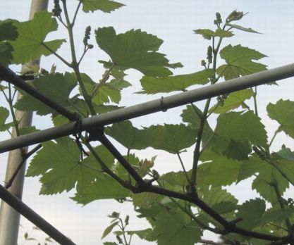 ♪ 雨止みて浅黄に金をまとう芽に空を映して光る水玉 様々な新芽が勢いを増して伸び、黄金週間にふさわしい素晴らしい季節。 しかし、連日25℃以上の夏日がつづくのには参る。一昨日は30度を越した地域もあったほど、気候は夏への道を急いでいるようだ。 ここへ来て庭の葡萄にも花芽がついてきた。 棚が小さいので枝の延ばし方が難しい。基の方には全く芽が出ておらず、先へ先へと伸びていく。大きく湾曲させて誘引すればいいのだが、そのスペースがない。 今年はカナブン対策もしっかりして、去年よりはましなモノにしたいと思っているが、天候にも左右されるしどうなる事やら。 今年は、ヒヨドリの姿をほとんど見ないのでそちらの心配は要らないかもしれない。◆2006年5月8日よりスタートした「日歌」が千首を超えたのを機に、「游歌」とタイトルを変えて、2009年2月中旬より再スタートしました。◆2011年1月2日からは、楽歌「TNK31」と改題してスタートすることにしました。★ 「ジグソーパズル」 自作短歌百選(2006年5月~2009年2月)
