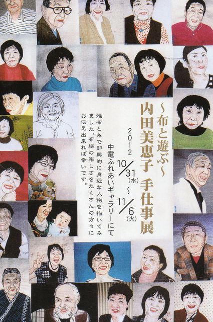 ♪ DMの写真に先を越されしを知りし夕べや初蜜柑食む 岐阜県中津川に住む知人のキルト作家からDMが届いた。 写真には身近な人を即興で表現したと、表情豊かな似顔絵がたくさん載っている。残り布を使ったソーイングで、知人の人柄までも窺える雰囲気を上手く表現されている。 私も、絞り染めでカリカチュアをやってみたいと思っている矢先にこのDMだ。「やられた!」という感じ。 絞り染めでこの写真のように写実的に表現するのはほとんど不可能で、余程特徴を捉えて省略・誇張しないと似顔絵にはならない。その点、ミシンワークはかなり細かい表現が可能なので、この様な作品も不可能ではないと思うが、表現力となるとまた話は別だ。 彼女・内田美恵子さんは、「ミセス暮しをつづるパッチワークキルト展第4回ミセス大賞」で「二〇〇二、秋」が優秀賞を受賞、「第一回原田泰治の世界をキルトで遊ぶ絵画キルト展」では大賞を受賞するなど、その世界での実力者だ。「第一回原田泰治の世界をキルトで遊ぶ絵画キルト展」 大賞受賞作品「とうちゃんのトンネル」(クリックで拡大) ここで使われているのは古い麻の蚊帳。それを新たに何色もに染め直して用している。その染めを担当したのが私で、古い麻は毛羽立って細かい糸クズが大量に染液に浮遊して大変だったことを思い出す。 彼女は、長年パッチワーク・刺繍講師としても活躍。5年ほど前から、ライフワークとして布の人物画に取り組み、同級生など60人を"描いて"きた。「苦労するのは、表情をとらえるチャンス。イメージが出来上がれば、手持ちの布を組み合わせてミシンで抑え、一気に仕上げる」と内田さん。今回は生き生きと体温が伝わる肖像のほか、「大好きな」オニをモチーフにした作品15点ほどを紹介するとのこと。~布と遊ぶ~「内田美恵子 手仕事展」 2012年10月31日(水)~11月6日(火) AM9:00~PM4:30(最終日は12:00まで) 中津川駅前にある「中電ふれあいギャラリー」(中津川太田町12-1-17) TEL0573-66-1231◆2006年5月8日よりスタートした「日歌」が千首を超えたのを機に、「游歌」と タイトルを変えて、2009年2月中旬より再スタートしました。◆2011年1月2日からは、楽歌「TNK31」と改題してスタートすることにしました。★ 「ジグソーパズル」 自作短歌百選(2006年5月~2009年2月)
