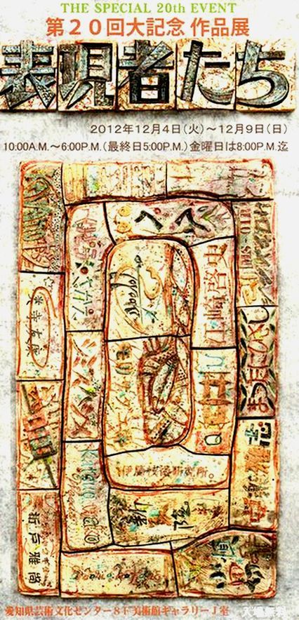 ♪ ねんごろな歯みが工程二つ終え湯船に浸かる晩秋の夜 来月初めに始まるグループ展に出品する作品の制作中。 糸入れという最も面倒でかつ重要な第一工程が済んで、あとは染めて、糸を引き締めて、また染めるという最終段階にようやく漕ぎつけた。 染めを最低4回繰り返し、ロウケツ染めの技法も併用するため、その間に蝋を置く作業も入る。制作に掛れる日数はあと6日しかない。 乾燥しているしそこそこ気温は上がる時期なので二次加、工三次加工を繰り返すには好都合の季節。何とか間に合いそうだ。 「表現者たち」DM クリックで拡大 メンバーの陶芸家が得意の陶板の技法を使って、出品者の名前を各々の出したデザインをもとに陶板に焼いた名前を組み合わせたもの。 「表現者たち」第20回記念大会 作品展 日時 平成24年12月4日(火)~9日(日) 10:00~18:00(最終日は5:00まで) 場所 愛知県芸術文化センター8F美術館ギャラリーJ室 出品者は、様々な表現世界で作品制作しているプロ・アマ老若19名。年に一度の晴れ舞台で、何が出るかは当日を迎えないと分からない。 若生克夫 森真一郎 ミスター・タナカ 伊藤栄 ぺぺ 須藤豊明 ジョージCASINO 河野ホシュナク・レジック 奥寺友康 江崎啓史 伊藤技術研究所。伊藤伸朗 ひげラク商店 アントニオなかね 松谷壽 清水肇 西脇治 小田切慎平 森貞之 メンバーの代表を務める「ペペ」が、ブログに展覧会の様子をアップしているのでご覧あれ。「お絵かきしようね」2010年12月◆2006年5月8日よりスタートした「日歌」が千首を超えたのを機に、「游歌」と タイトルを変えて、2009年2月中旬より再スタートしました。◆2011年1月2日からは、楽歌「TNK31」と改題してスタートすることにしました。★ 「ジグソーパズル」 自作短歌百選(2006年5月~2009年2月)
