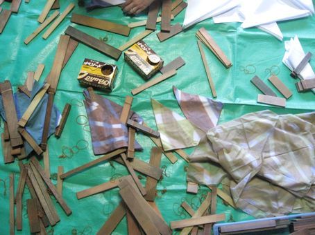 ♪ 結婚を控える娘通いきてハンカチ百枚さわさわと染む 先月の下旬、11月25日に結婚式を控えた名古屋の女性が、ネットでHPを観て、引き出物の一部に自分の手造りの品物を加えたい。是非、こちらで絞り染めをしたいが出来るかどうかと問い合わせてきた。 急な話で時間もあまりないが、手作りの品を一品加えたいと言う趣旨には賛同できるので、何とかそれに応えられないかと考えた。 板締めの2色染めでハンカチ程度のものを染めるなら何とか出来そうなので、その旨を伝える。聞けば70枚は必要と言う(結局100枚)。1日では到底無理なので、2時間ずつ3日間かけて染めることになった。 初日は、順調に行ったが、2回目の日には自分も染めてみたいと言う友達を連れてきたため時間を取られ、大幅にオーバーしたにもかかわらず予定の数がこなせなかった。 最終日の昨日は、残りの40枚を、兎に角染め上げることに専念し、わき目も振らずに一気に染め上げることに。 布を畳んで板を当て、輪ゴムで止め、染める準備が出来ると、3セットずつ次々に染めてゆく。染色は、堅牢度のあるスレン染料を使うため取り扱いが難しい。こればっかりは任せられないので、こちらが一手に引き受けて染めることになる。 一色染まれば、板を外して板の位置をづらして再度輪ゴムで止め、もう一度違う色で染める。「下手な考え休むに似たり」だ。どうなるのかはわからないのだから、ただもう思いつきで板を当てて止めていく。 まさに即興の生ライブだ。 今回は時間配分を考えて、2枚重ねにしたものを3セット(6枚)ずつ染めることにしたので、同じ色のものが6枚できるが、それぞれ板の当て方は変えるので柄は3種類になる。 染める度に染色の色も替えるため、同じものはセットの1組・2枚しか存在しない。 ハンカチの畳み方も日によって変え、3種類の方法を使った。そのため、染め上がりは日によって全く違うものが出現し、興味の尽きない楽しい3日間となった。 布を広げるたびに「わあ、きれい!」「おもしろーい!」「すごい!すごい!」と歓声をあげて、思いがけない模様の出現に大喜び。 時間はオーバーしたが、何とか予定の枚数を染め上げ、50種類の二色染めハンカチ100枚が完成した。 千差万別の個性豊かな作品が揃って、折角だから全部を床に広げて眺めたいくらい。引き出物として渡したその場で全員に広げてもらって、お互いに見せ合ってほしいと言って笑った。 楽しく、お目出度い門出のお手伝いができ、言祝ぎの代わりとして100枚のハンカチを送り出してやれたことを嬉しく思っている。◆2006年5月8日よりスタートした「日歌」が千首を超えたのを機に、「游歌」と タイトルを変えて、2009年2月中旬より再スタートしました。◆2011年1月2日からは、楽歌「TNK31」と改題してスタートすることにしました。★ 「ジグソーパズル」 自作短歌百選(2006年5月~2009年2月)