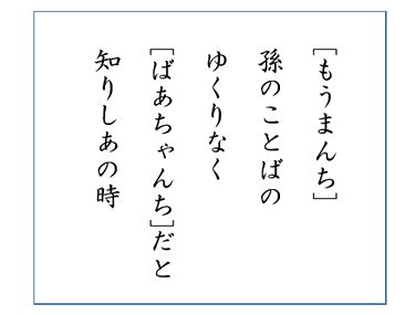♪ [もうまんち]孫のことばのゆくりなく[ばあちゃんち]だと知りしあの時‥‥‥‥‥‥‥‥‥‥‥‥‥‥‥‥‥‥‥‥‥‥‥‥‥‥‥‥‥‥‥‥‥‥‥‥‥‥‥ 孫がことばをしゃべり始めるが、チンプンカンプンでさっぱり分からない。 この「もうまんち」は来る度に、日に何度も口にしていて、何のことかさっぱり分からなかった。出掛けに母親から「ばあちゃんち」に行くよ、と言われるので、それを真似て言っているのだと、ある日突然に判明したのだった。 他にも「あちここここ」という訳の分からん事を言っていた。それがどうやら「かとりせんこう」の事だと分かったのは大分経ってからのこと。熱いと蚊取り線香が一緒になってる。 これからはもっと面白くなるぞ。言葉も男の子の方がゆっくりと進歩する。チンプン語録が増えそうだ。 「伝染(うつ)るんです。」で知られる漫画家の吉田戦車さんは不条理ギャグから一転、子育て漫画を描いていて、ビッグコミックオリジナルで「まんが親」を連載中。妻で漫画家の伊藤理佐さんとの間に生まれた娘(6)との日常を独特のタッチで描いている。 吉田さんは、このフィクションまじりのエッセー漫画を娘が生まれたときには描くと決めていたんだとか。娘が生まれたら、僕は仕事を減らして「しばらく家事やります」って。料理や掃除、洗濯などを1、2カ月やったそうだ。 パソコンに「週刊娘」というフォルダーを作って、0歳のときから撮った写真から週に1枚ほど選んで入れて、息抜きで奥さんと見て笑っているんだとか。 いいねこれ、週1枚っていうところがいい。私もたくさん撮ってある写真を整理して、時系列でならべてみようっと。 日常の中で面白いことを探すのは大変だし、子どもが成長するにつれて、しなくなることもある。ちゃんと単語が言えなかったとか、大人になったらこんな泣き方はしないなとか、常にメモ帳を手元に置いて、気づいたことを書いているんだとか。 ホッキョクグマを「ほきごむな」と言ったりして、4歳までは本当に面白かった。小学生になった今はもうないので赤ちゃんだったころが懐かしい、と。 商売柄、素直に見ないというか、変なところだけを探そうとしているところがあって、それが距離を置いた感じになる。自分の後ろにカメラを置いている感じなんだそうです。 そうなんだよね。子育て中の当人は余裕が無いので子供の観察メモなんか、なかなか思い付かないが、職業柄こういう事ができるわけだ。 私が子供の幼い時の言葉を、覚えているのは2つだけ。「かみなり」を「かみがり」、「しおれる」を「しわれる」と言っていた。こっちの方が実際の感じが良く出ている気がして、記憶に残っている。 孫の事ともなれば話は別だ。成長していく道筋を客観的に観察できるわけだし、それはとても楽しいしことだ。これからも注意して聞き取ってメモしておく事にしよう。◆2006年5月8日よりスタートした「日歌」が千首を超えたのを機に、「游歌」とタイトルを変えて、2009年2月中旬より再スタートしました。◆2011年1月2日からは、楽歌「TNK31」と改題してスタートすることにしました。◆2014年10月23日から「一日一首」と改題しました。◆2016年5月8日より「気まぐれ短歌」と改題しました。★ 「ジグソーパズル」 自作短歌百選(2006年5月~2009年2月)☆短歌集「ミソヒトモジ症候群」円居短歌会第四歌集2012年12月発行●「手軽で簡単絞り染め」