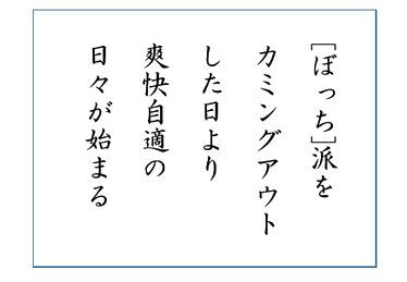 ♪ [ぼっち]派をカミングアウトした日より爽快自適の日々が始まる‥‥‥‥‥‥‥‥‥‥‥‥‥‥‥‥‥‥‥‥‥‥‥‥‥‥‥‥‥‥‥‥‥‥‥‥‥‥‥ 「ボッチ」(ひとりぼっち)や仲間はずれなど、マイナスイメージがつきがちだった1人での行動に、前向きなイメージを与える「ソロ活」の達人・フリーライターの朝井麻由美さん(29)の行動・活動に同調する声が巷にいっぱいだ。 彼女は、『1人でいることに「嫌だ」「惨めだ」というネガティブイメージを持つのは、大勢のほうが楽しいという風潮があるから、そう思っているだけ。 1人でいろいろな所に行くのは私にとって当たり前のこと。他人と一緒だと、予定を合わせるのが面倒くさいとか、人と一緒にいると気を使わなければいけないとかあります。例えば、焼き肉で、私はカルビだけで幸せで、タンやロースには興味がないのに、皆で頼んだタンに胃袋を割かねばならない。それはもったいないじゃないですか。カルビのためだけに胃袋を使いたい。このように人と一緒だと効率が悪い。だから、1人で行動することが当たり前になりました。』 と。 『1人で出かけることは恥ずかしく、惨めで、私が1人で行くことをすごいと思われる。2人以上で動くことを当たり前としている人が多い。 自分自身のことを認められないので、他人から認められることを求めているのではないでしょうか。精神的に自立していれば、1人だろうが、大勢でいようが、変わりません。 ソロ活に関する記事への反響は大きく、「勇気を与えられた」「1人で行動したかったのにできなかったが、記事のおかげでできるようになった」と共感が寄せられ、ソロといいつつ、インターネットやSNS(ソーシャル・ネットワーキング・サービス)でつながっているような気がする』とも言っている。 2014年9月から「レッツエンジョイ東京」というので、ソロ活動をリポートしている。仕事ではあるが、自分の生き方にオーバーラップしているので楽しんでやっているようだ。 父はコラムニストの泉麻人。出版社勤務を経てフリーのライターに。トレンドからサブカルチャー・女子カルチャー、グルメや雑貨まで幅広いジャンルを手がけ、体当たり取材が得意という。「内容紹介」 “普通"とは誰が決めたのだろう。なぜ、“普通"と違っていると、いけないのだろう。 「人の多い飲み会へ行くと、ぐったりと疲れる」「美容院やタクシーでは、ひと言も話しかけられたくない」 “みんなでワイワイ"がうまくできない=ひとりで行動することを愛しすぎている著者が、「普通はひとりではいかない場所」の最高峰、デートスポット(やグループレジャー)をソロで行脚。 ■霜降り肉とひとり用グリルを持ってバーベキューに行ってきた ■結婚しないけれど、ひとりでウェディングフェアに行ってみた ■浴衣の男女がウェイウェイする東京湾納涼船にひとりで乗ってきた ■誰もいない秋の砂浜でひとりスイカ割りをやってみた ■リムジンのバースデープランを貸し切って「ひとり誕生日パーティー」を開いてきた 共感不要! 理解不要! ひとり好きの、ひとり好きによる、ひとり好きのための「ぼっち」指南書! 私も全く同感。「映画と旅行とパチンコは独りに限る」とずっと公言してきたが、基本的には独りで行動するのが好き。かと言って人間嫌いという訳でもなく、交流を拒否しているわけでもない。 朝井麻由美さんの影響で、「女の人も一人になりたいのだ。もう我慢することは無い。わが道を行けばいいのいだ!」そう思い始めた人が沢山いるようだ。良い事だと思う。 一人カラオケ、一人焼肉、一人映画、一人飲み、一人旅、徐々に当たり前になりつつある。周りの目なんか気にしない、悠々自適の人生を歩む人が増えることに乾杯。◆2006年5月8日よりスタートした「日歌」が千首を超えたのを機に、「游歌」とタイトルを変えて、2009年2月中旬より再スタートしました。◆2011年1月2日からは、楽歌「TNK31」と改題してスタートすることにしました。◆2014年10月23日から「一日一首」と改題しました。◆2016年5月8日より「気まぐれ短歌」と改題しました。★ 「ジグソーパズル」 自作短歌百選(2006年5月~2009年2月)☆短歌集「ミソヒトモジ症候群」円居短歌会第四歌集2012年12月発行●「手軽で簡単絞り染め」