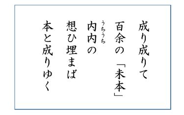 ♪ 成り成りて百余の「未本」内内(うちうち)の想ひ埋まば本と成りゆく‥‥‥‥‥‥‥‥‥‥‥‥‥‥‥‥‥‥‥‥‥‥‥‥‥‥‥‥‥‥‥‥‥‥‥‥‥‥‥ 自分で完成させるという意味で名付けた「未本」。作品展に出すための予定の百冊を、取りあえず揃えることが出来た。 まだ少し余裕がありそうなので、幾つかのアイデアを形にしたいと思っているが、間に合うかどうか。偶然や結果オーライは無いので、心に余裕が無いと失敗する。慌てるとロクなことが無いので、そこは重々こころを落ち着けて・・・。 思えば色んなやり方をやってきた。ネットで調べたりそれらしい本も買って試してみたが、結局は自分なりのやり方を見つけないと上手くいかない。 道具もないし、製本の手順、糊の種類や濃度、合わせ糊の作り方や塗布の仕方、背固めのや糸綴じの方法、扉・奥付、見返し用紙の選定、染布の裏打ちの仕方、見返しの貼り方などなど全部手探りで、結局は我流でやることに。 まあ、それが楽しくてやってるわけで、何につけ手っ取り早く教室に通って習うということを良しとしない私。失敗を重ねるうちに、その事の本質が分かって来る。その本質は分野が違っても役立つことが多い。身に付けたものが多くなれば、大概の事は見様見真似で出来るようになるものだ。 何とかバカって侮れない。本人がその気にさえなれば、何だって出来る。或いは、出来るという自負を持っている。その一事に賭ける執念と持続力がもたらすものは、計り知れない可能性を秘めている。試行錯誤を重ね、頭を使いながら体で覚えた事は、もはや体の一部となっているわけで理屈を超えてゆるぎない。 私の製本はまだ3年ばかりだし、まだまだ熟練には程遠い。職人を目指しているわけでもないが良いものを作りたい思いは強い。アルチザンというよりもアーチストとしての意識の方が強いが、それはそういう意識があるというだけのレベルかも知れないが・・。 いわゆるルリユールの、中身に関係にない様なコリに凝った表紙を作る作家にはなりたくないとは思っている。◆2006年5月8日よりスタートした「日歌」が千首を超えたのを機に、「游歌」とタイトルを変えて、2009年2月中旬より再スタートしました。◆2011年1月2日からは、楽歌「TNK31」と改題してスタートすることにしました。◆2014年10月23日から「一日一首」と改題しました。◆2016年5月8日より「気まぐれ短歌」と改題しました。★ 「ジグソーパズル」 自作短歌百選(2006年5月~2009年2月)☆短歌集「ミソヒトモジ症候群」円居短歌会第四歌集2012年12月発行●「手軽で簡単絞り染め」