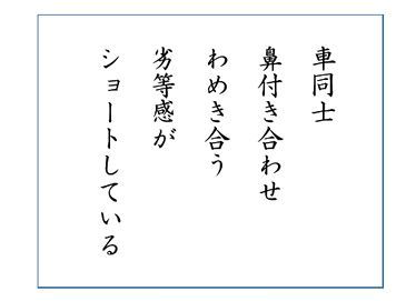 ♪ 車同士鼻付き合わせわめき合う劣等感がショートしている‥‥‥‥‥‥‥‥‥‥‥‥‥‥‥‥‥‥‥‥‥‥‥‥‥‥‥‥‥‥‥‥‥‥‥‥‥‥‥ 狭い農道を歩いていて、私の目の前で車が停まった。向こうから車が来るのが見える。その車とすれ違うために行くのを控えて待つ大勢だ。丁度道幅が少しだけ広くなっているので、気を利かせた訳だ。 向こうからの車がもじもじしていてなかなか来ない。おずおずとやって来たと思ったら、停まっている車の前方で停車してしまった。待っても動こうとしない。 それで、待っていた車の運転手が業を煮やして、発進し前の車の鼻先に着けた。そこから大声でのバトルが始まった。 「てめえ、何でそこで停まっとるー」 先方も何かモゴモゴ言っている。「通れないがね」 「待っとるのに、何で停まっとるんだよー!」 傍で発端から見ていたのでその諍いの理由は明らか。停まって待っていた車の避け方が中途半端で、どう見てもすり替われない。まだ余裕があるのだからしっかり幅寄せして待てば何の問題も無かった。“自分は行きたいのを我慢して待った”という一点だけに、変なプライドをむき出しにしている。 ”道を譲るという事そのものに抵抗が有ったにもかかわらず、俺はそれを実行して待っていたんだぞ”と。その思いが中途半端な幅寄せになり、心半分に相手に嫌がらせをしてやろうという魂胆が見え見えだ。 その場で一部始終を見ているのもバカバカしいので、私はさっさとその場を離れた。大声でやり合っていたが、最後は前から来た車が結局はバックしたようだ。そうしなければ埒が明かないと判断したのだろう。塀の上でのすれ違い 全く、困った奴だ。こういう輩は心に問題を抱えていることが多い。 それは「劣等感」という最も厄介な荷物。自分ではそうと気付かず自分を認めさせる事に精いっぱいで、相手側の事は二の次になる。下手に抵抗すると逆上することがあるので手に負えない。 劣等感は向上心のエネルギーにもなるが、マイナスに働く事も多い。間違ったプライドという自己愛(自分への偏見)とが抱き合わせになっている。敗けたくないという、恐怖心にも近い思いが時に暴力的な態度になって、自己防衛をすることになる。 劣等感を無くすには、苦手なモノに挑戦して克服することが一番だと思う。苦手なものから逃げ続けている間は、劣等感から逃れることは難しい。 どんな優秀な人でも劣等感は持っている。ただ凡人との違いは、その事に向き合って克服しようとして来たか否かが大きく違う。自分を知り自分に課題を与えて、果敢に挑戦して来た人は違う。 人にさせられるのではなく、自らがその最も嫌な部分を変えようと思うことでしか為し得ない事だけに難しい。◆2006年5月8日よりスタートした「日歌」が千首を超えたのを機に、「游歌」とタイトルを変えて、2009年2月中旬より再スタートしました。◆2011年1月2日からは、楽歌「TNK31」と改題してスタートすることにしました。◆2014年10月23日から「一日一首」と改題しました。◆2016年5月8日より「気まぐれ短歌」と改題しました。★ 「ジグソーパズル」 自作短歌百選(2006年5月~2009年2月)☆短歌集「ミソヒトモジ症候群」円居短歌会第四歌集2012年12月発行●「手軽で簡単絞り染め」