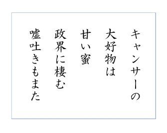 ♪ キャンサーの大好物は甘い蜜 政界に棲む嘘吐きもまた‥‥‥‥‥‥‥‥‥‥‥‥‥‥‥‥‥‥‥‥‥‥‥‥‥‥‥‥‥‥‥‥‥‥‥‥‥‥‥ 宝島社が1月7日、全国紙3紙の朝刊に掲載した見開きの全面広告。読売新聞と日刊ゲンダイに載せた、「敵は、嘘」バージョンと朝日新聞に載せた、「嘘つきは、戦争の始まり」の2バージョンが秀逸だった。 わが家は朝日新聞、「なかなかいい!」「よくぞ言ってくれた!」と拍手を送った。読売新聞と日刊ゲンダイ「敵は、嘘。」朝日新聞「嘘つきは、戦争の始まり。」 今年の企業広告の意図について、宝島社では次のように明かしている。「敵は、嘘。」「嘘つきは、戦争の始まり。」をメインコピーに、2つのビジュアルを使用しました。連日メディアを賑わしている隠蔽、陰謀、収賄、改ざんの事件など、気がつくと、世界中に嘘が蔓延しています。 それを伝えるニュースでさえ、フェイクニュースが飛び交い、何が真実なのか見えにくい時代になってしまいました。 人々は、次から次に出てくる嘘に慣れてしまい、怒ることを忘れているようにも見えます。嘘が蔓延している今の世界に対して、嘘についてあらためて考え、そして、嘘に立ち向かってほしい、そんな思いをこめて制作しました。日本の最高権力者も平然と嘘を吐く。その周りの人もそれを容認し追従している。嘘で固められた政府に慣らされてはいけない。この癌細胞を転移させてはいけない。