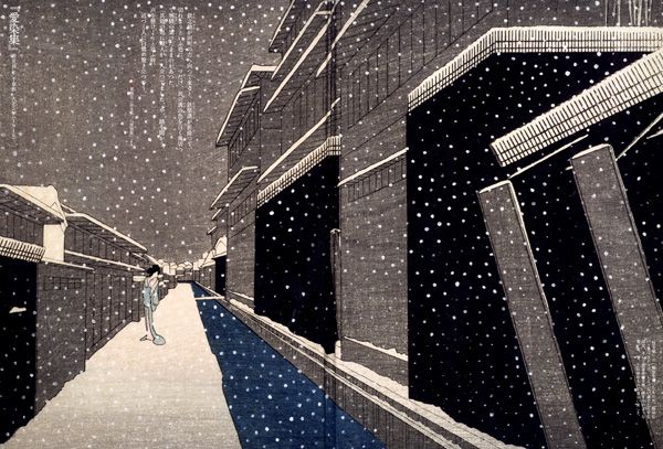 泉鏡花「註文帳」/『愛染集』より 「註文帳」の一場面を描いたものか。極端なパースペクティヴ、しどけない姿でたたずむ遊女、そして画面全体を覆い隠すかのような雪、雪、雪。この世のものではない美しさ。