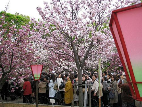 大阪・造幣局は種類が多いのが有名で、関山、普賢象、松月、紅手毬、芝山、黄桜、楊貴妃など125品種がそろい、約370本を数えるという。