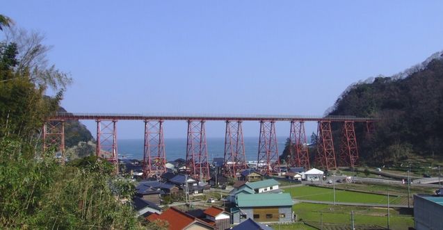 JR山陰本線鎧駅と餘部駅の間にかかる高さ41.5m、長さ310.7mの鉄橋で、トレッスル式と呼ばれる鋼材をやぐら状に組み上げた橋脚が特徴で、この種の鉄橋では日本一の規模を誇っていました。