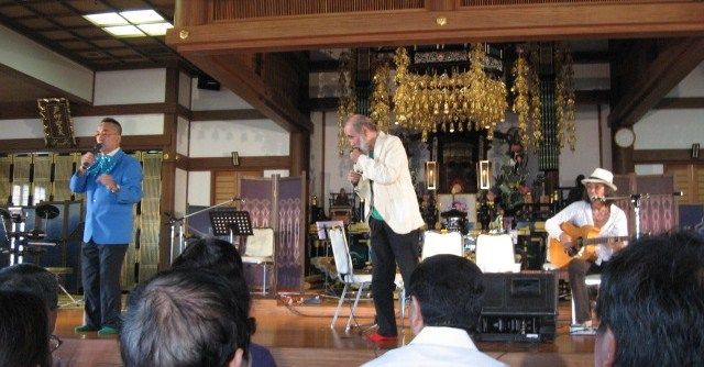 本堂の祭壇の前でロカビリーを歌うミッキー