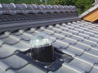 そんな瓦の屋根に取り付ける明かり採り用の天窓が、改良されてて紫外線をカットしたものが有るんですね。瓦施工の業者が開発した昔の天窓式の採光装置で、ここでは「太陽光照明」と呼んでいます。