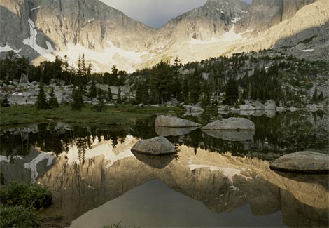 ワイオミング州、ロンサム湖。ウィンドリバー山脈の山々に囲まれた圏谷(けんこく)、サーク・オブ・ザ・タワーズ(Cirque of the Towers)の姿が湖面に映る。