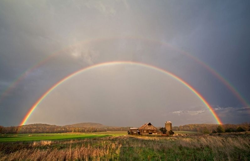 アメリカ、バーモント州シャンプレーン湖近く。雨上がりの空に副虹も。