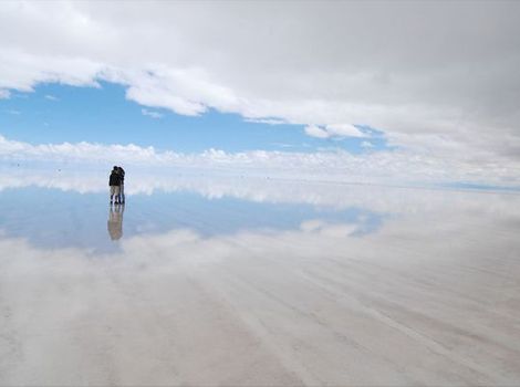 ウユニ塩原、ボリビア ここは世界でも有数の平坦な場所で、雨が降ると地表が鏡になる。