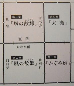 5年の歳月をかけた力作「かぐや姫」「風の故郷」「大漁」の46面の襖絵は、精緻な筆致で大胆な構図の中にデフォルメされたモチーフが奔放に描かれていて、見応え十分なものだった。