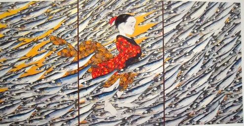 ここにいる少女は、中島氏自身だ。 『やっと、こう…強くなれたかなっていう思いがしましたね。今回、ふすま絵に描いたですね「大漁」はですね、前回、金子みすゞさんの「大漁」描いたんですけど、今回は、僕自身の「大漁」だと思ってるんですよ。』 と、「クローズアップ現代」で語っている。