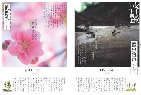 ししてそれをさらに三つに分けたのが「七十二候」で、5日ずつに区切って漢詩のような名前がつけられている。