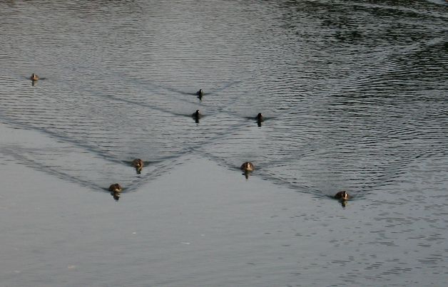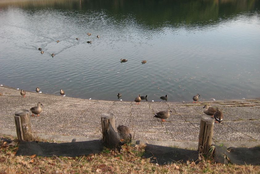池にはカルガモなどの水鳥が棲みついている。管理の人が餌をやっているので、人の姿を見ると寄ってくる。