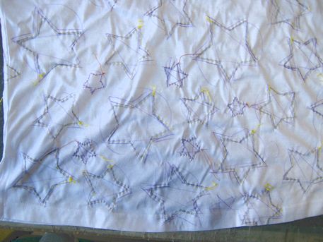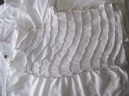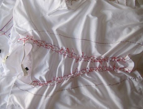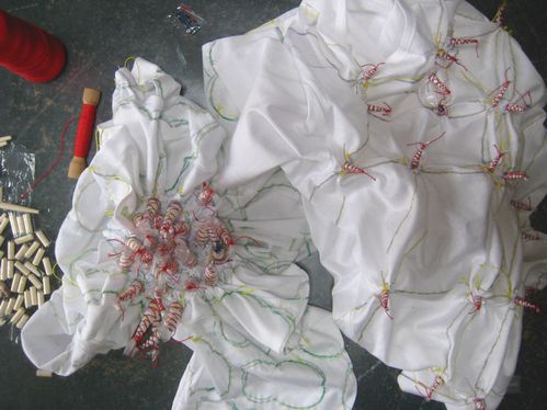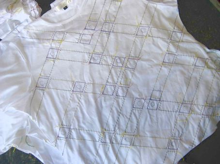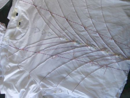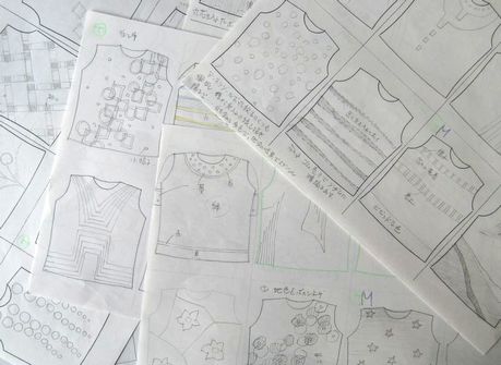 その線をすべて、技法によって色を変えた糸で縫っていく。この時も必要があれば修正を加えながらの作業となる。糸の太さも技法に合わせて変えてある。