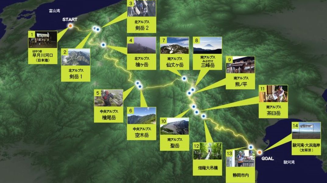 日本海側の富山湾から日本アルプスの北アルプス・中央アルプス・南アルプスを縦断して太平洋側の駿河湾までの約415キロメートルを一週間(+予備日1日)で、交通機関を一切使わずに自分の足で走る・歩くことで競う競技。