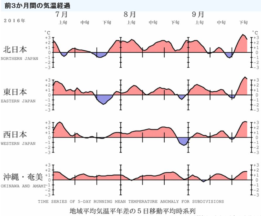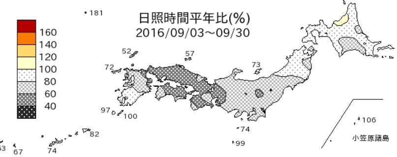 9月中下旬は、台風の影響で日本の広い範囲で日照時間が平均の4分の1にしかならず、記録的に少ない日照時間が記録された。北東部の太平洋沿いの地域では日照時間が平均の26%、北東の日本海沿いでは平均の38%、南西では44%となった。