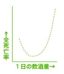 しかし、どうやら統計ミスから通用しないという説が、オーストラリア国立薬物研究所のターニャ・クリスティー博士らのチームによって国際アルコール薬物研究誌「JSAD」の2016年3月号に発表されたらしい。結論は、できるだけ飲まない方が良いというもので、酒は身体に悪いというわけだ。全死亡率:病気だけなく、事故、事件を含めたあらゆる原因による死亡率。「全く飲まない」人を1とした場合の各飲酒量毎の相対的な死亡率をグラフにするとJ型のカーブになる。
