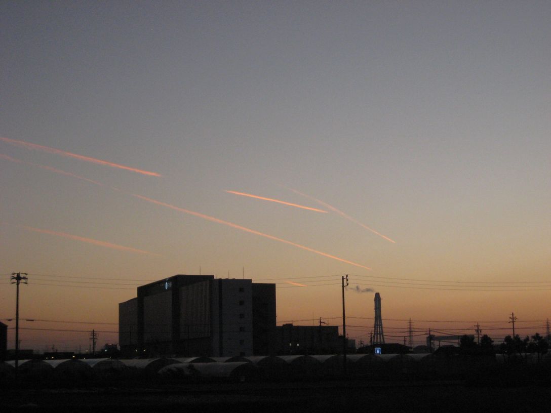 飛行機雲が夕焼けて、快晴の空に模様を添える。雲一つない空は味気ないが、こうして神のさい配が興趣を与えてくれる。