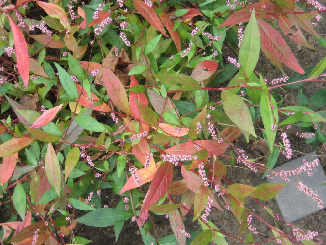 田んぼの横に真っ赤な花が美しかったタデ(赤まんま)。移植して種がこぼれた二年目、沢山の芽があちことから出た。