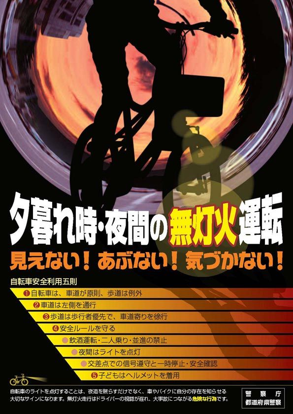 また、真っ暗な中を無灯火で走って来る自転車にも面食らった。黒っぽい服を着ていて、目の前まで来てから気づいてビックリ。本人は車が来ればライトで道は明るくなるし、自分もよく見えていると思い込んでいるのだろうが、それは大間違いだ。
