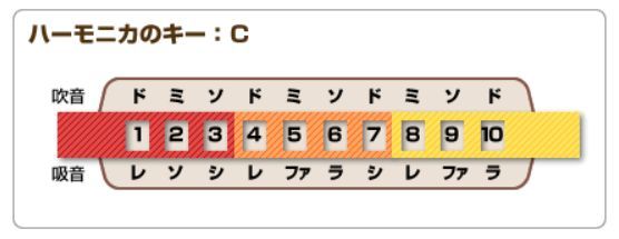 吸う方は、4レ・5ファ・6ラ・7シで、この間が1オクターブの音階となっている。