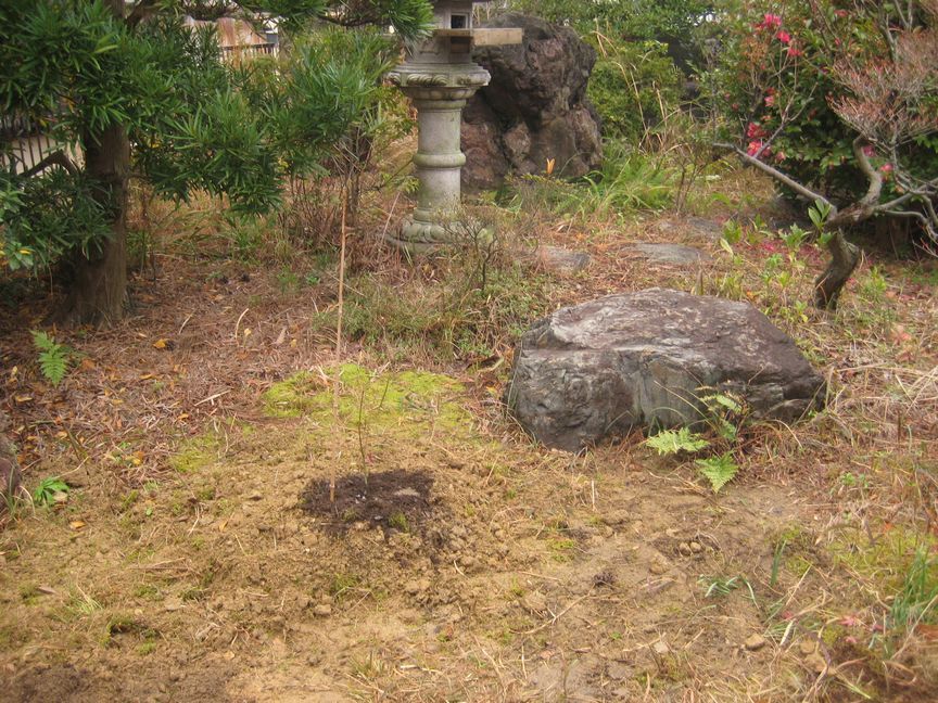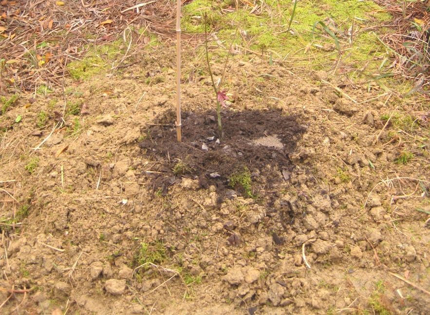 埋め戻した土をもう一度掘り返して、元の土と腐葉土を混ぜて嵩を増やしす。そこへ再度最初の土を入れて土の面より高くなるようにして植え付け。
