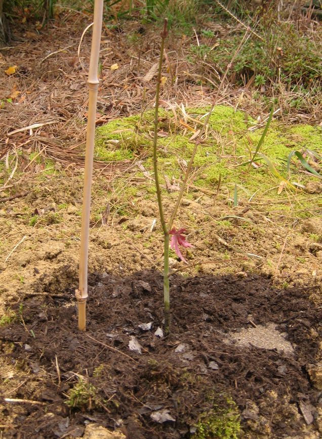2015年の4月に種を蒔いて首尾よく発芽し、大事に育ててきたもの。4年目を前にして漸く地植えとなったもので、まだ苗は小さく35cmもないくらいのもの。鉢植えでの根がしっかり回っていたので大丈夫だろうと思う。