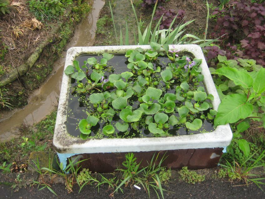 写真だけでも撮ってやろうと思ったが、バスタブが汚れているのとホテイアオイの影で中が暗いため、上手く撮れない。黒メダカやーい。